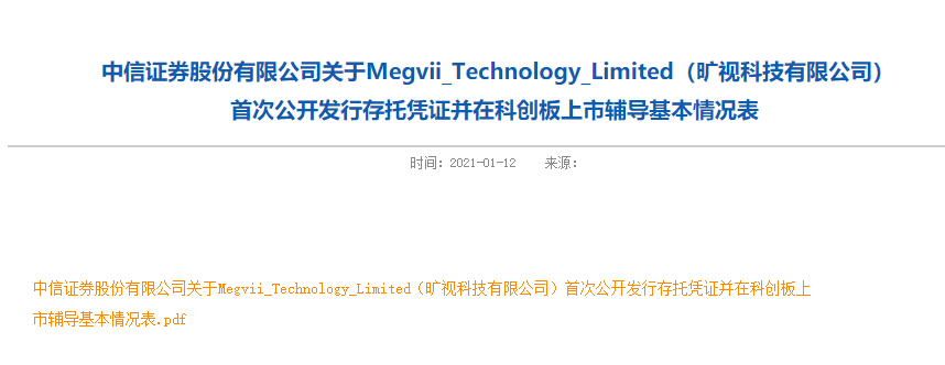 1月12日,据北京证监局网站消息,国内AI独角兽企业旷视科技已于2020年9月与中信证券签署关于公开发行存托凭证并在科创板上市之辅导协议。