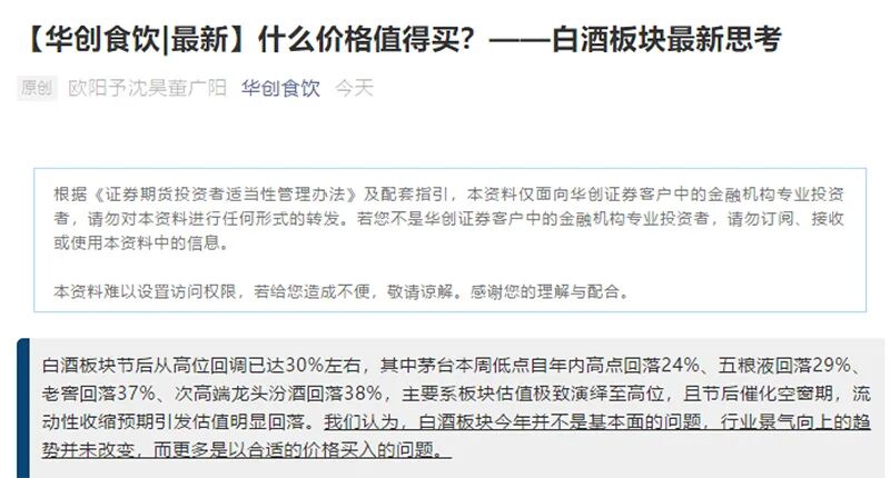 华创证券研究所所长、知名白酒行业分析师董广阳也于今日早间发布了一篇名为“什么价格值得买”的研报。董广阳表示,白酒板块节后自高位回调已达30%左右,其中贵州茅台自年内高点回落24%、五粮液回落29%、泸州老窖回落37%、次高端龙头汾酒回落38%,主要系板块估值极致演绎至高位,且节后催化空窗期,流动性收缩预期引发估值明显回落。