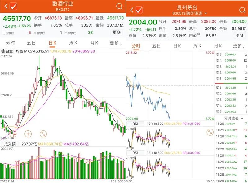 白酒板块持续下行,泸州老窖、山西汾酒跌逾7%,古井贡酒跌逾6%,五粮液、洋河股份等跌逾4%。贵州茅台也再度下挫,半日跌幅2.72%,股价再度逼近2000元/股的关口。