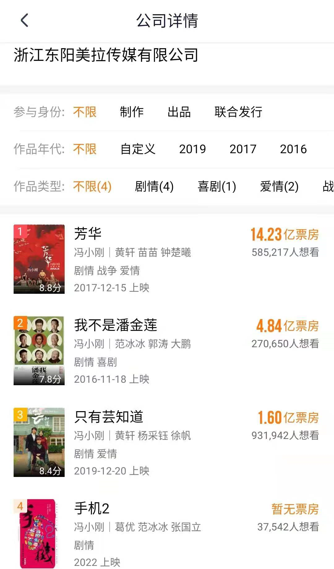 中国证券报记者注意到,除了《手机2》因卷入范冰冰事件影响而迟迟无法公映外,其他作品均鲜有公开资料,项目或遭遇搁浅。