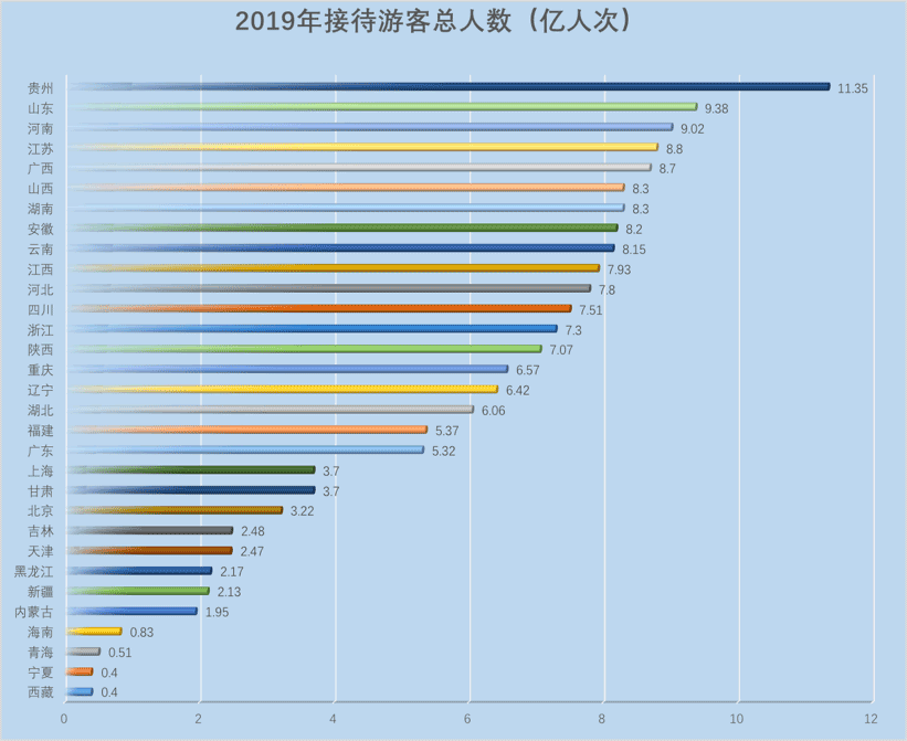 此外,山东、河南、江苏、广西、山西、云南、安徽、湖南等地全年接待游客也都超过8亿人次。