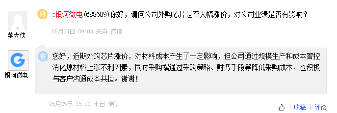 银河微电表示,近期外购芯片涨价,对材料成本产生了一定影响,但公司通过规模生产和成本管控消化原材料上涨不利因素,同时采购端通过采购策略、财务手段等降低采购成本,也积极与客户沟通成本共担。