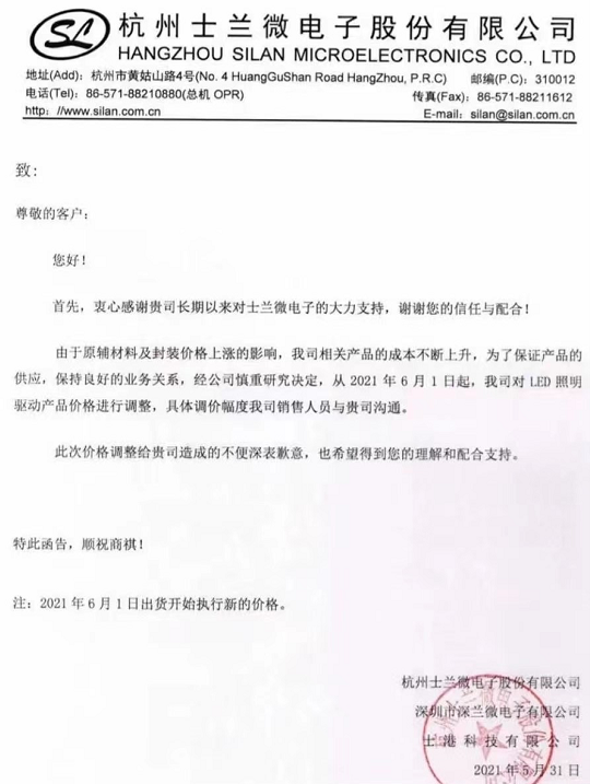 士兰微表示,由于原辅材料及封装价格上涨的影响,成本不断上升,公司决定自6月1日起,调高LED照明驱动产品价格。
