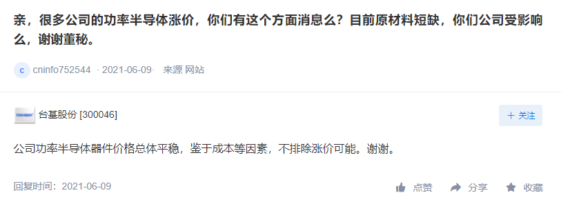 比如,台基股份6月9日表示,公司功率半导体器件价格总体平稳,鉴于成本等因素,不排除涨价可能。