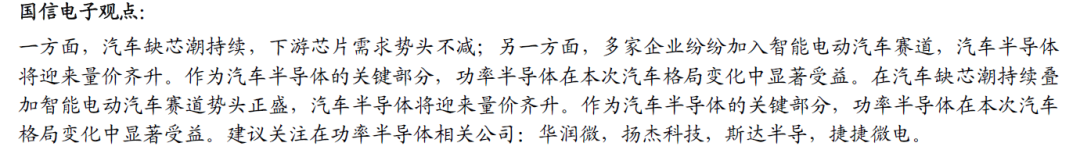 比如,国信证券表示,作为汽车半导体的关键部分,功率半导体在本次汽车格局变化中显著受益。在汽车缺芯潮持续叠加智能电动汽车赛道势头正盛,汽车半导体将迎来量价齐升。