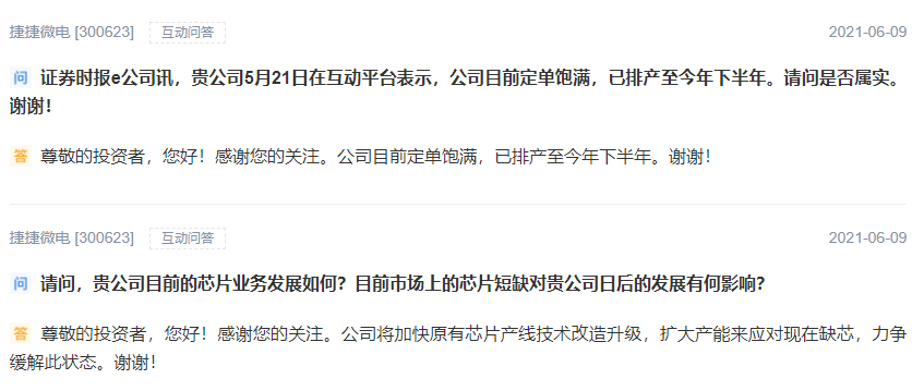 捷捷微电表示,公司目前订单饱满,已排产至今年下半年。公司将加快原有芯片产线技术改造升级,扩大产能来应对现在缺芯,力争缓解此状态。