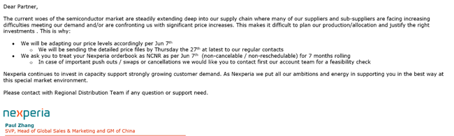 闻泰科技旗下安世半导体宣布,于6月7日提高产品价格。据悉,自6月份起,安世半导体原厂出货价格已调涨不少。