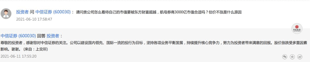 今年6月10日,有投资者就东方财富总市值逼近中信证券,向中信证券提问,中信证券回应称:“公司以建设国内领先、国际一流的投行为目标,坚持各项业务平衡发展,持续提升核心竞争力,努力为投资者带来满意的回报。股价的涨跌受多重因素的影响。”