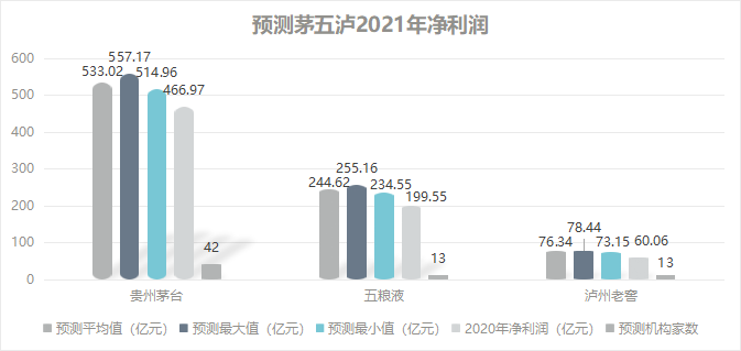 从后市预测来看,机构判断白酒企业业绩仍然会处于较高增长态势。数据显示,共有42家机构给出贵州茅台2021年净利润533.02亿元的平均预测值,较2020年上涨14.14%;13家机构给出五粮液2021年净利润244.62亿元的平均预测值,较去年上涨22.59%;13家机构给出泸州老窖2021年净利润76.34亿元的平均预测值,较去年上涨27.11%。