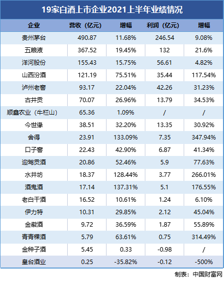 上半年,舍得酒业、青青稞酒、水井坊的净利增幅位列19家白酒上市公司的前三名,分别为347.94%、314.49%、266.01%;除此以外,酒鬼酒、山西汾酒的净利润增幅也达三位数。