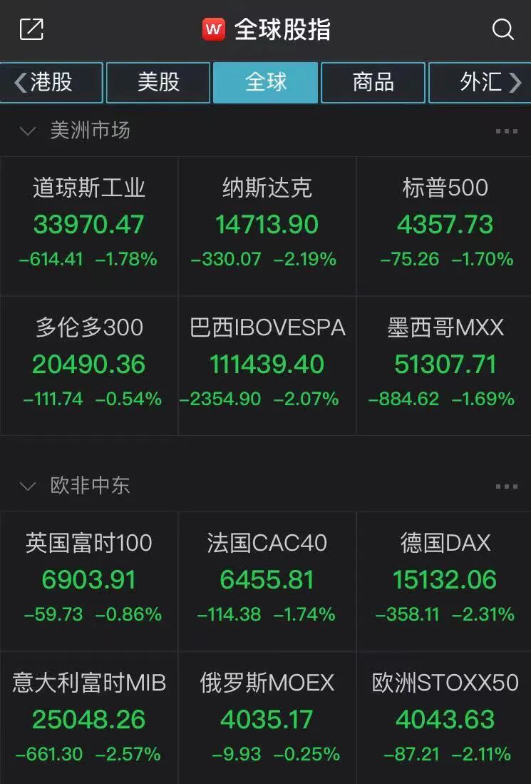 截至收盘,标普500指数收跌1.7%至4357.73点,创5月12日来最大跌幅。道指收跌1.78%至33970.47点,为7月19日来最大跌幅。纳指跌2.19%,报14713.90点,并跌破50日均线关键技术位。