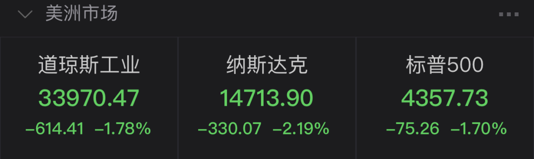 美股方面,道指跌1.78%,报33970.47点;标普500指数跌1.70%,报4357.73点;纳指跌2.19%,报14713.90点。
