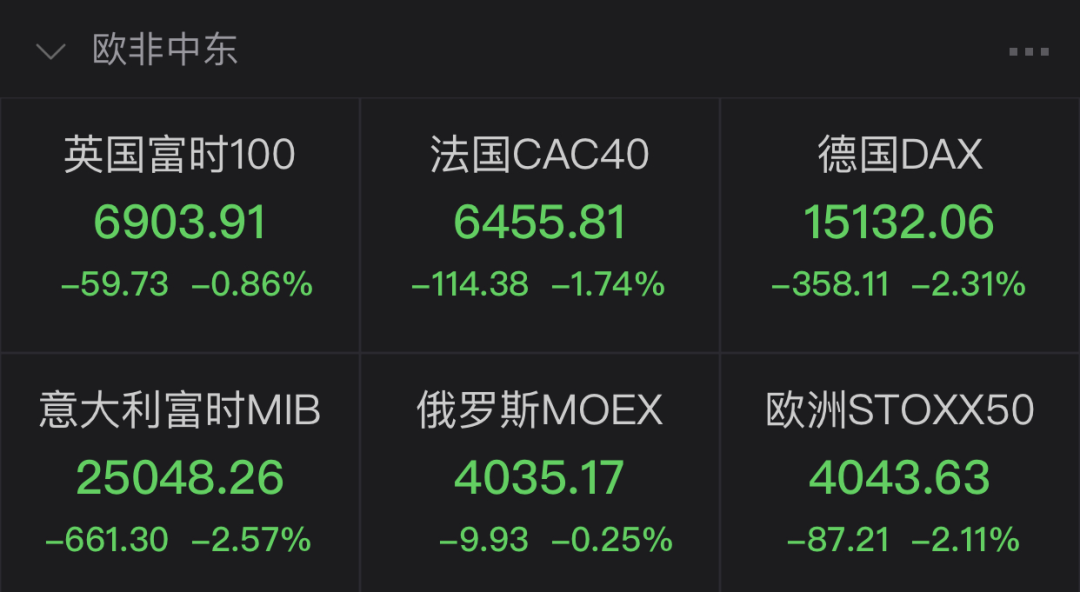 此外,欧股也全线下跌,德国DAX指数跌2.31%,报15132.06点,创4个月以来新低;法国CAC40指数跌1.74%,报6455.81点;英国富时100指数跌0.86%,报6903.91点;意大利富时MIB指数跌2.57%,报25048.26点。