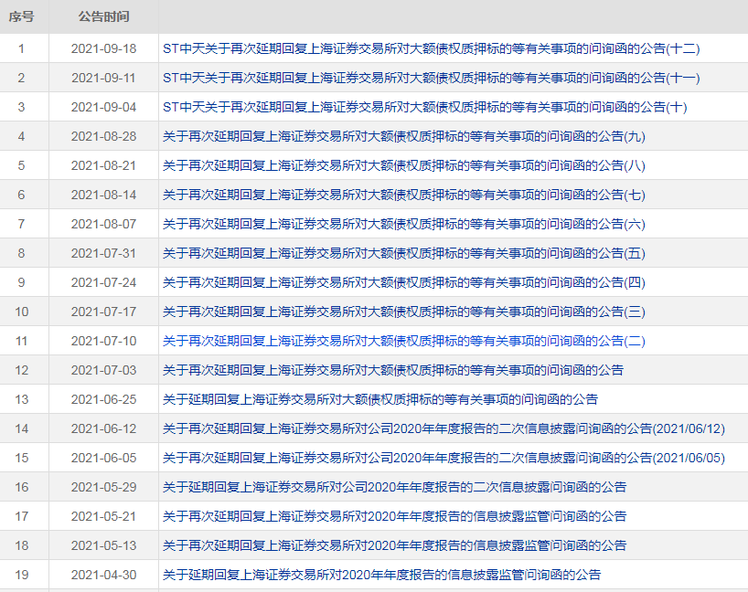 针对监管部门的问询函,ST中天也是一再延迟回复,东方财富choice数据显示,今年以来,ST中天竟发布了19次延期回复的公告。