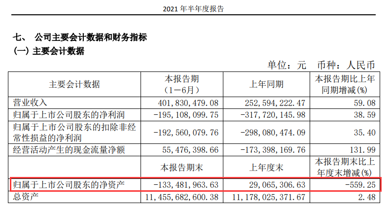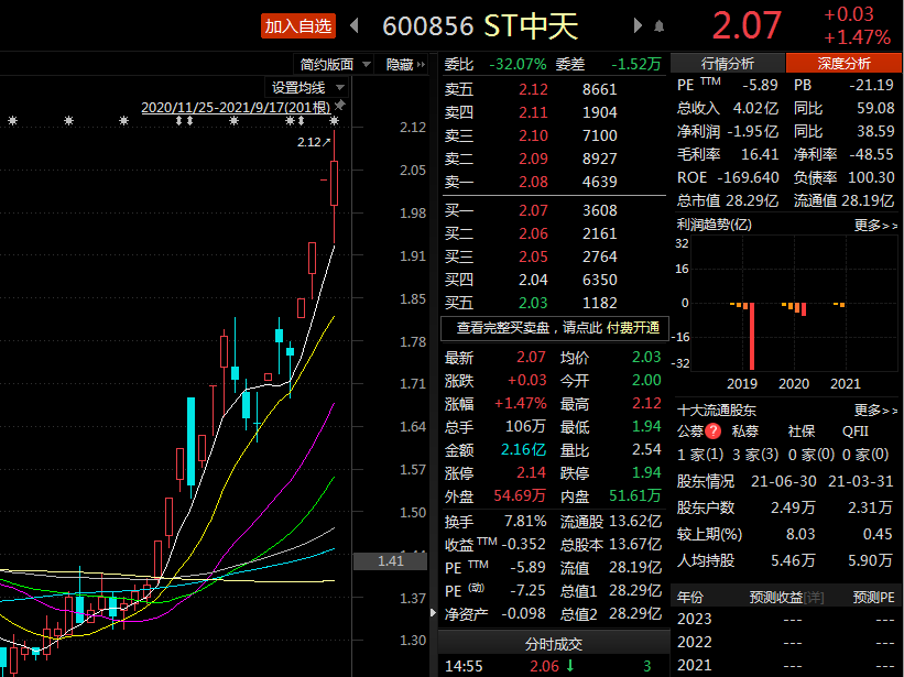 更为重要的是,在各类退市指标上,ST中天都“徘徊”在退市边缘。在去年5月和今年2月,其股价跌破1元;在2018年-2020年,公司连续3年亏损;2021年半年报显示,其净资产为负,目前的净资产为-1.33亿元。