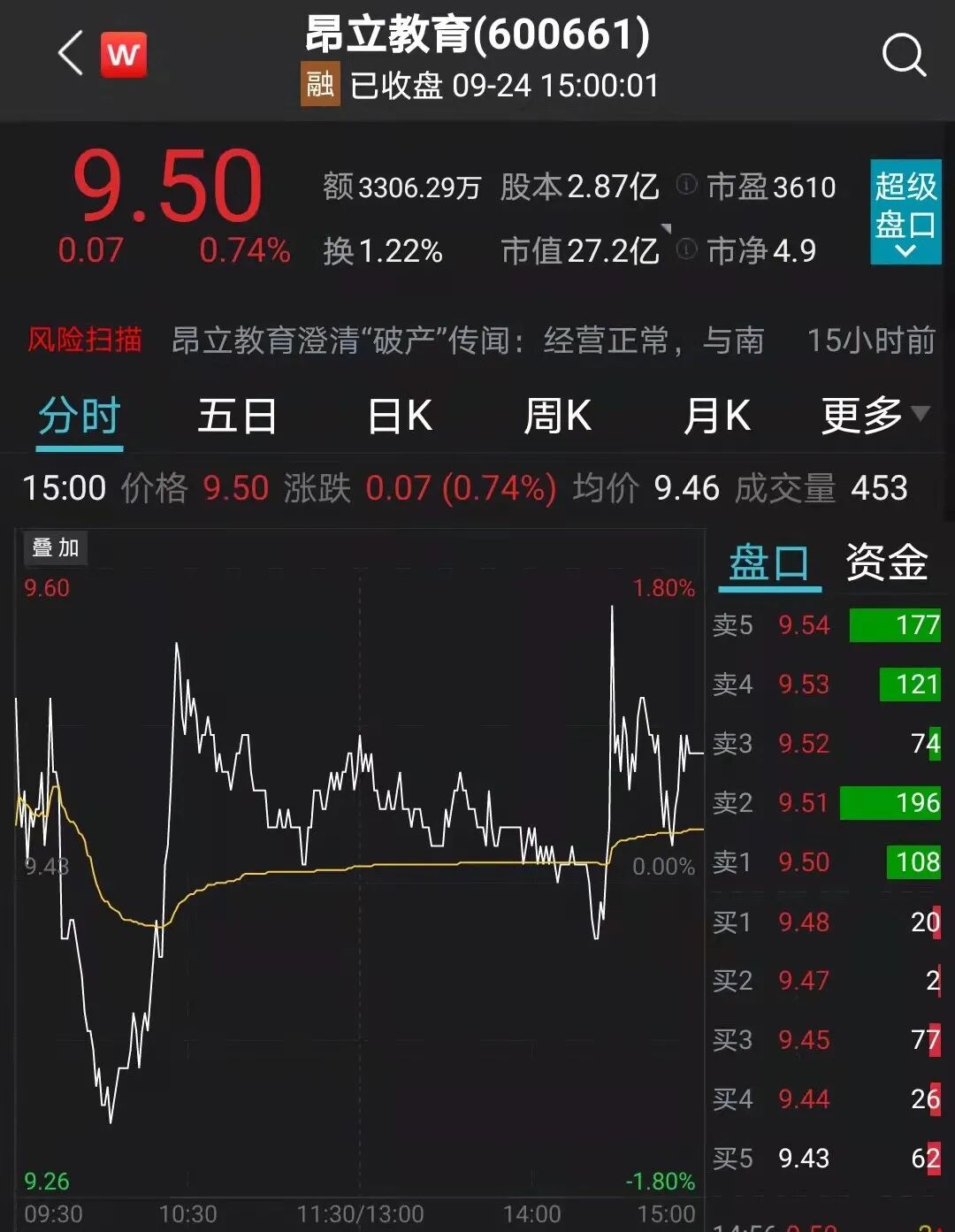 9月24日,昂立教育上涨0.74%,收报9.5元。