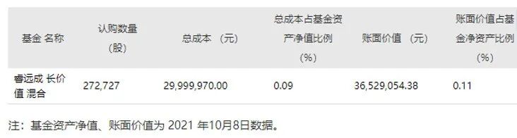 睿远基金于10月11日发布的旗下基金投资非公开发行股票公告显示,傅鹏博和朱璘管理的睿远成长价值以2999.99万元的成本参与了春风动力非公开发行股票的定向增发,总成本占基金资产净值的比例为0.09%。