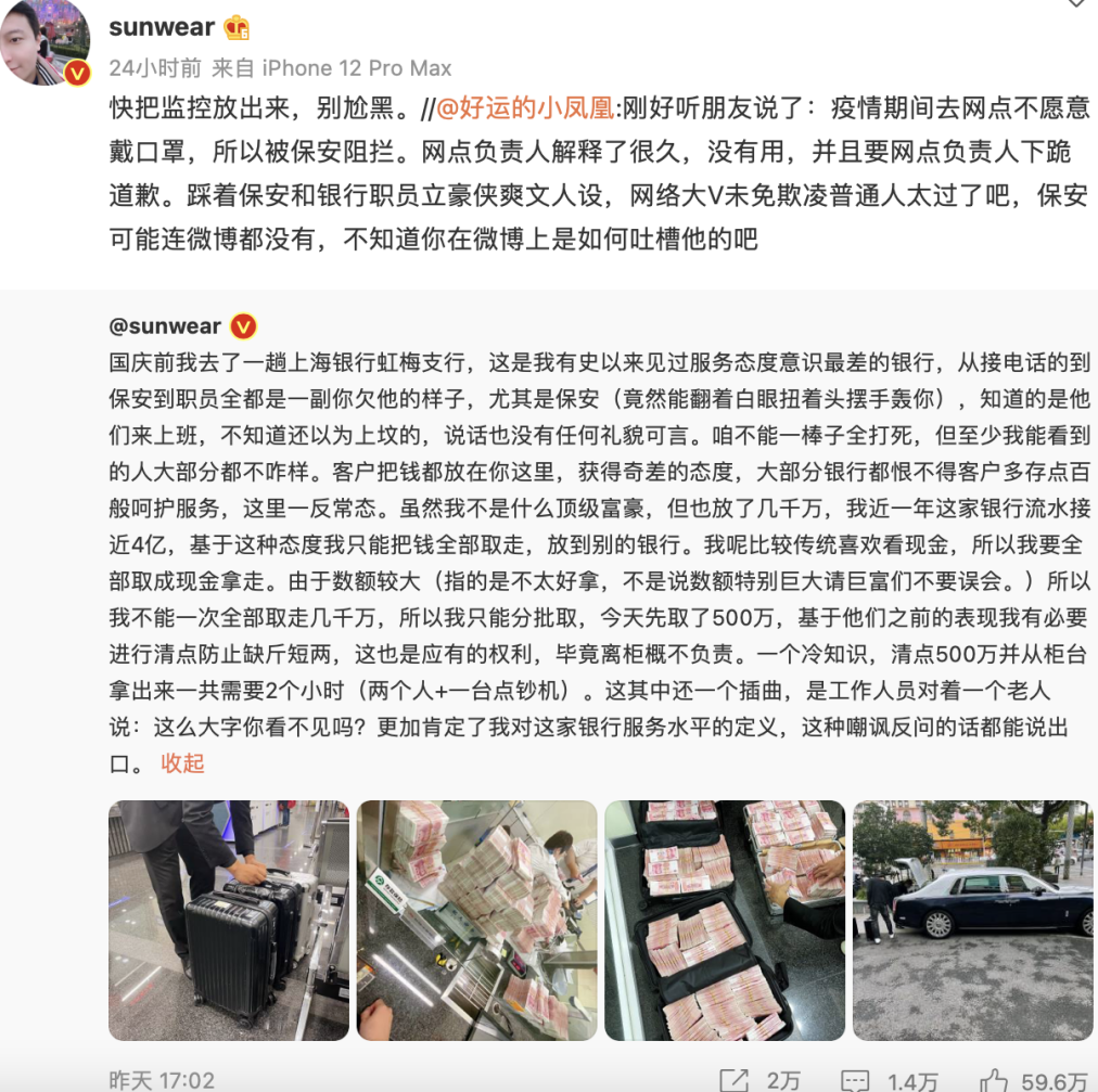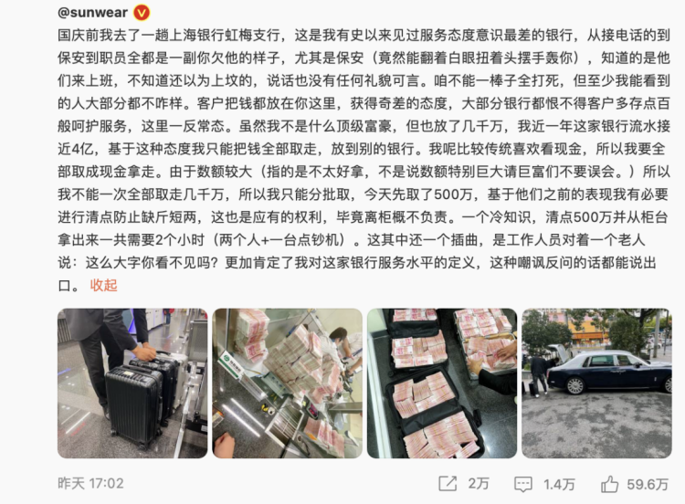 “我虽然不是什么顶级富豪,但也在这家银行放了几千万元,近一年流水接近4亿。”这位名为@sunwear的微博用户于10月16日公开表态,直指上海银行“服务差”,并表示,基于这家银行的态度,只能选择把钱全取走放别的银行,而其个人喜欢看现金,所以要全部取成现金拿走。