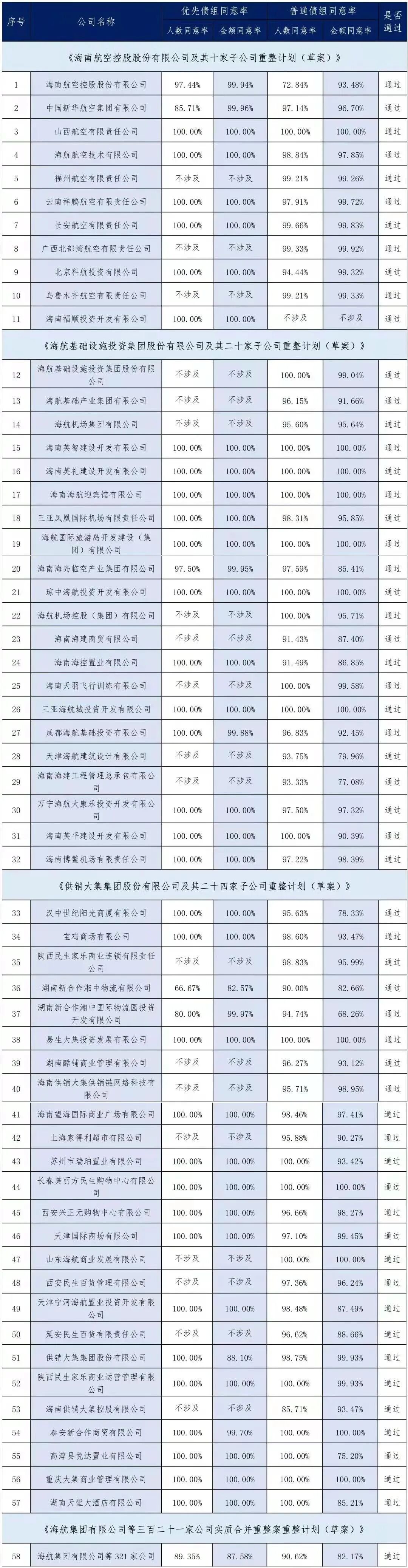 10月23日15时,海南省高级人民法院公布对海航各重整计划草案表决核查的结果,海航集团及相关企业破产重整案的各重整计划(草案)均已获得表决通过。