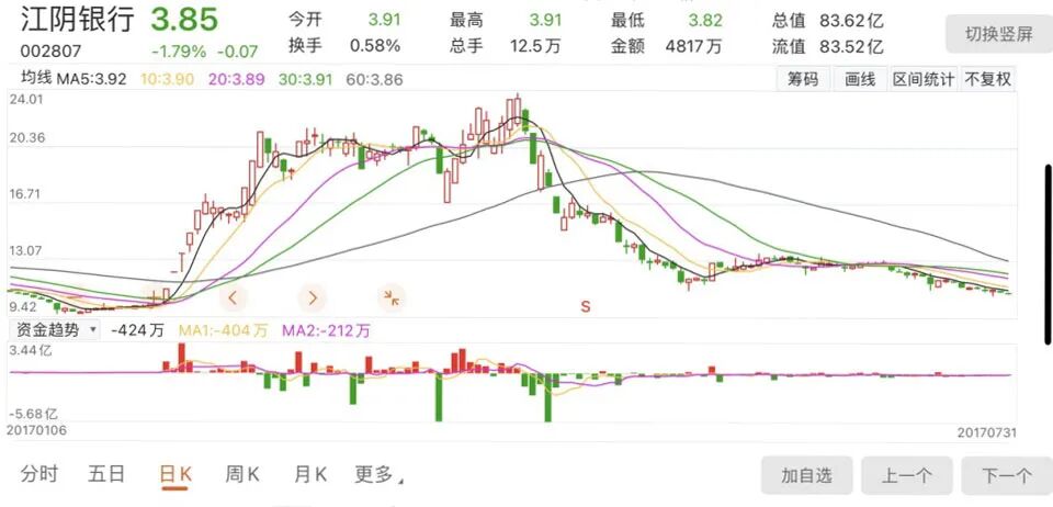 以江阴银行为例,该股于2016年9月2日上市,上市后连续10个一字涨停。随后在2017年2月迎来一波上涨,股价从9元左右最高涨到24元。不过,大涨过后则是股价的绵绵阴跌。