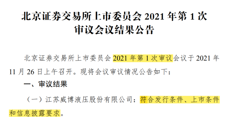 11月26日盘后,北交所发布消息称,威博液压公开发行及在北交所上市的申请获北交所上市委审议通过。这是北交所上市委履职后审议的第一个项目。