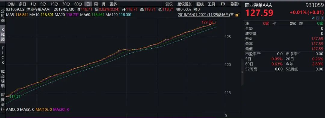 中证同业存单AAA指数于2018年1月11日发布,基点起计100。截至11月26日,该指数报127.59,年内涨幅2.69%,平均到期收益率2.59%,久期0.45年。