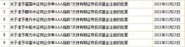 11月26日,据多位业内人士反馈,富国基金、鹏华基金、南方基金、中航基金、华富基金、惠升基金等6家公司上报的中证同业存单AAA指数7天持有期基金已正式获批。该类基金主要投向中证同业存单AAA指数,持有期为7天。